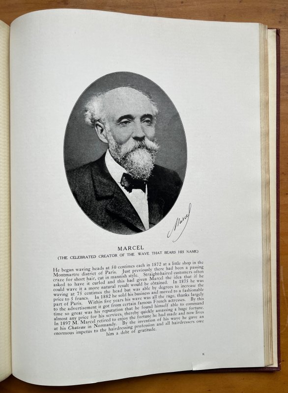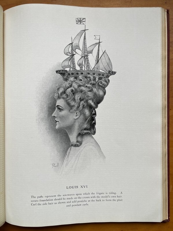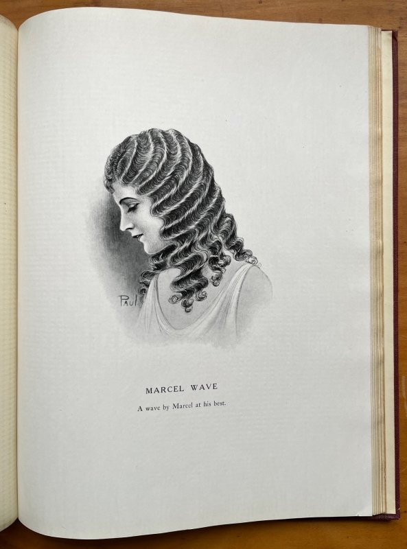 FIRST EDITION 4to. red cloth hardback with gilt titles to upper board. Pages unnumbered. Features 32 b/w plates of hairstyles through the ages, mostly with captions, 1 page of text concerning the change to short hair styles, and 1 b/w plate featuring a portrait and text about Marcel, the originator of the Marcel Wave. Every page has a textured translucent tissue-guard. Large ink inscription, dated 1980, to ffep. Very slight foxing to endpapers else clean and bright throughout. Slight fading to top 3cm strip of lower board, light wear to top and base of spine and corners, and faint mark to upper board which looks like a stitched scar - please see photos. A VERY GOOD COPY of a VERY SCARCE TITLE.