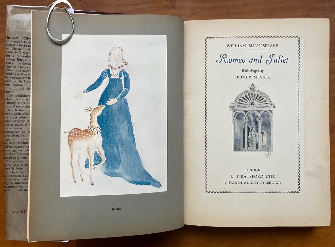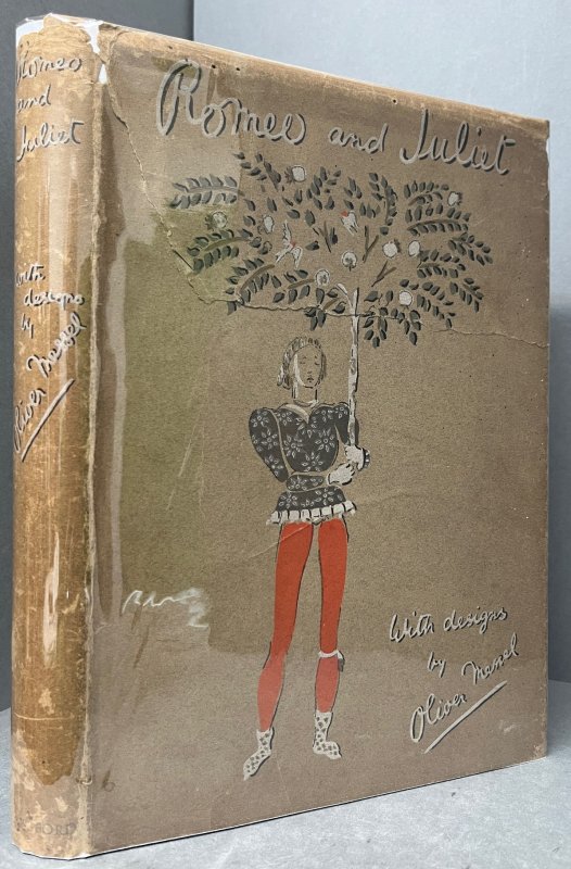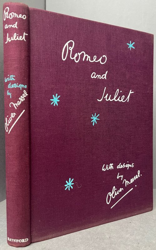 FIRST EDITION 4to. purple cloth hardback with titles and decorations in blue and white by Oliver Messel, in unclipped dust jacket. 96pp., profusely illustrated with 8 tipped-in colour plates on grey paper and 32 b/w plates, all being original designs by Oliver Messel for the Metro-Goldwyn-Mayer film production of 1936, starring Norma Shearer and Leslie Howard and directed By George Cukor. A clean copy with no markings or inscriptions. Occasional light foxing, mainly to prelims. Dust jacket has large closed tear across the front cover, some small areas of loss to top edge and rubbing to spine (please see photos) but still presents quite well. A VERY GOOD COPY in Good Dust Jacket.