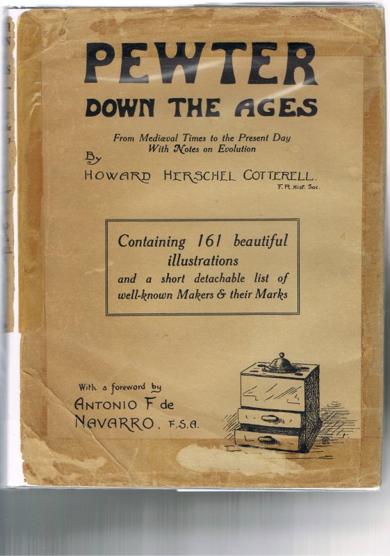 Sm 4to hardback bound in blue cloth gilt, with damaged dust jacket, 237pp, indexed, with 161 illus, includes 23pp stapled booklet of pewter makers and marks within pocket to rear pastedown. Boards lightly rubbed, dust jacket edgeworn with old tape repairs, front cover detached and loss to foot of spine. Overall a VG copy in a poor dust jacket.