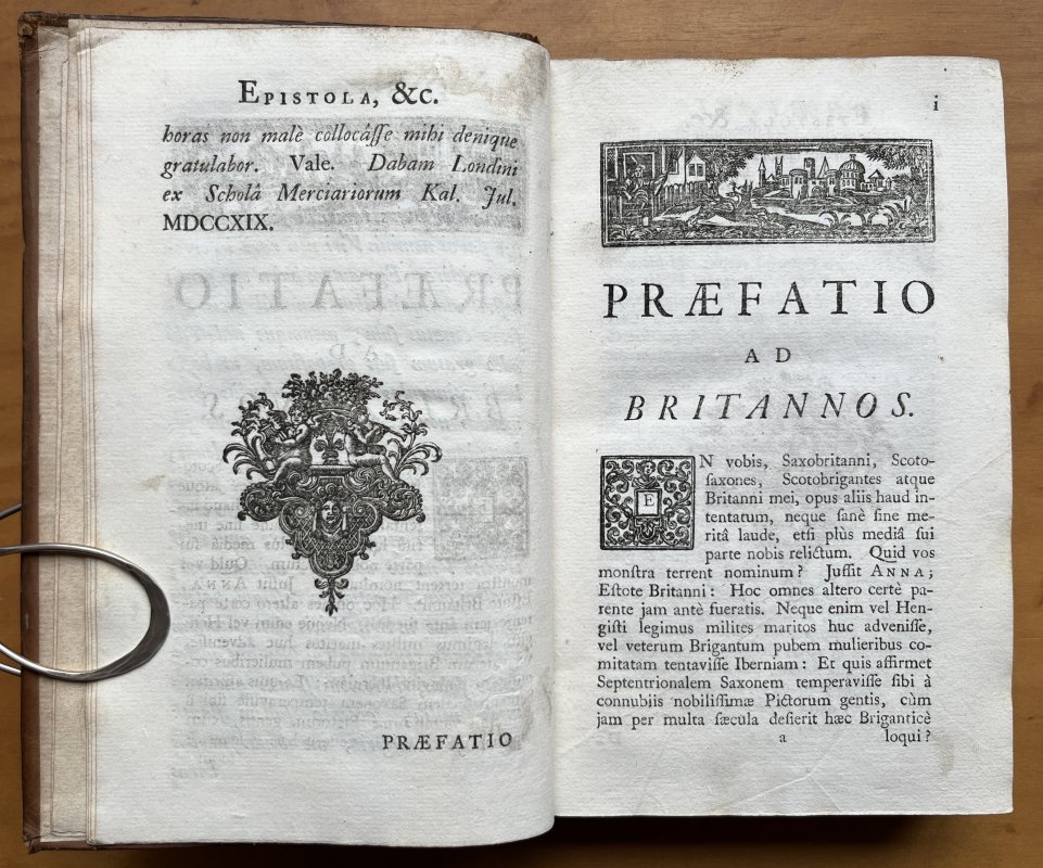 Second Edition TEXT IN LATIN 8vo. (approx. 20 x 12.5cm) contemporary full calf with raised bands, title label, gilt to spine. pp. [8], xiv, [4], 277, [19]; engraved frontispiece portrait by George Vertue. Some typographical embellishments throughout. Eduardi Luidii's [Edward Lhuyd] appendix on the signification of British place names and Index at rear. Armorial bookplate to inside front cover and a couple of pencil notes to ffep and ink notes to rfep. Internally tight and bright. Spine and edges of binding rather worn with some scuffing to boards. Overall a Good Copy.